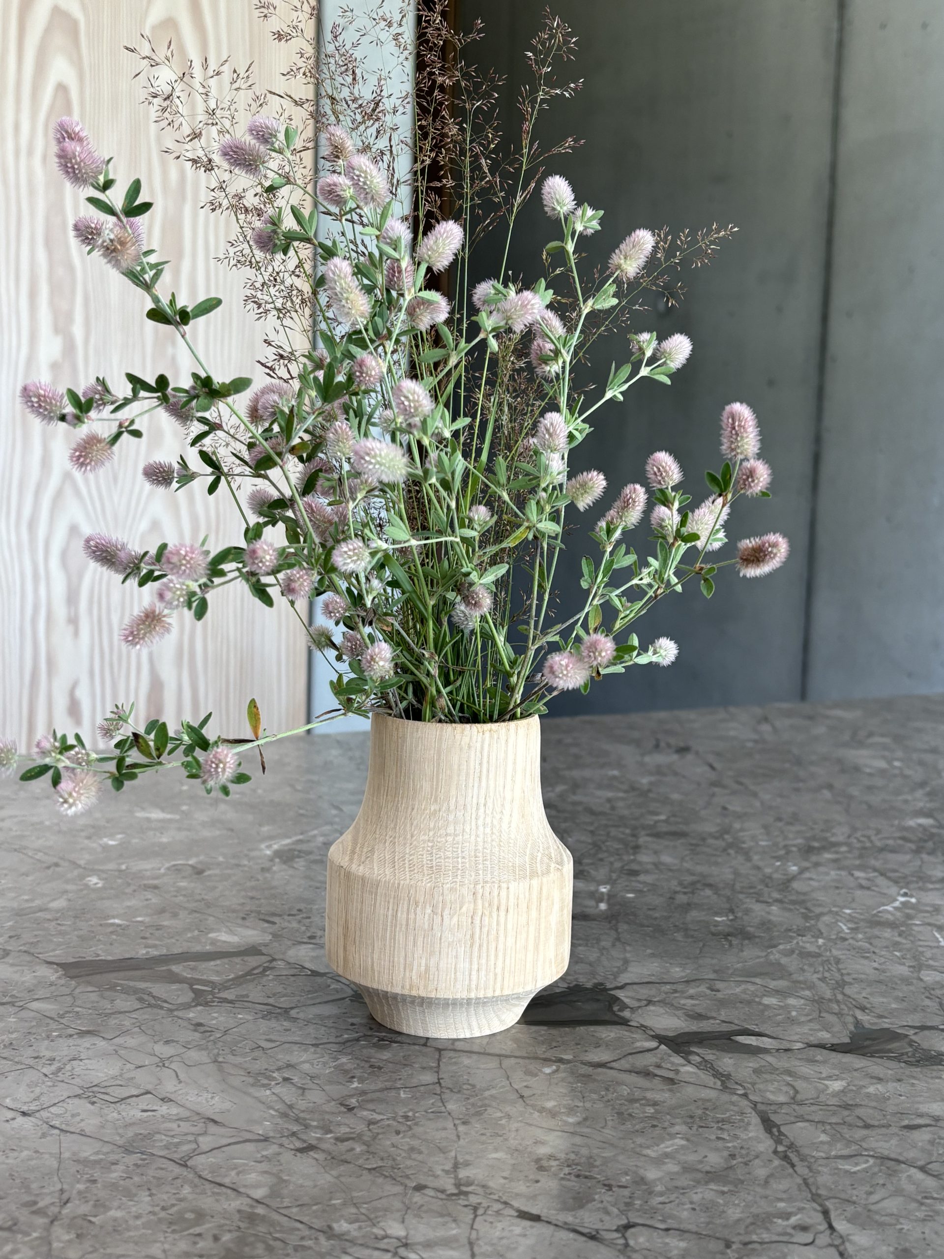 Its smooth curves and sculptural silhouette recall the elegance of 1960s Danish design, while the solid FSC-certified oak adds an organic presence that only grows more beautiful with time. A discreet glass insert allows you to use the vase with fresh flowers without compromising the integrity of the wood—a thoughtful detail that ensures lasting quality.